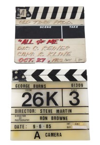 - a pair of clapperboards, one for the 1984 film All of Me co-starring Lily Tomlin and directed by Carl Reiner, and one for the 1985 CBS Television special “I, George Burns Comedy Week” of which Martin directed one episode (estimate: $600-$800)