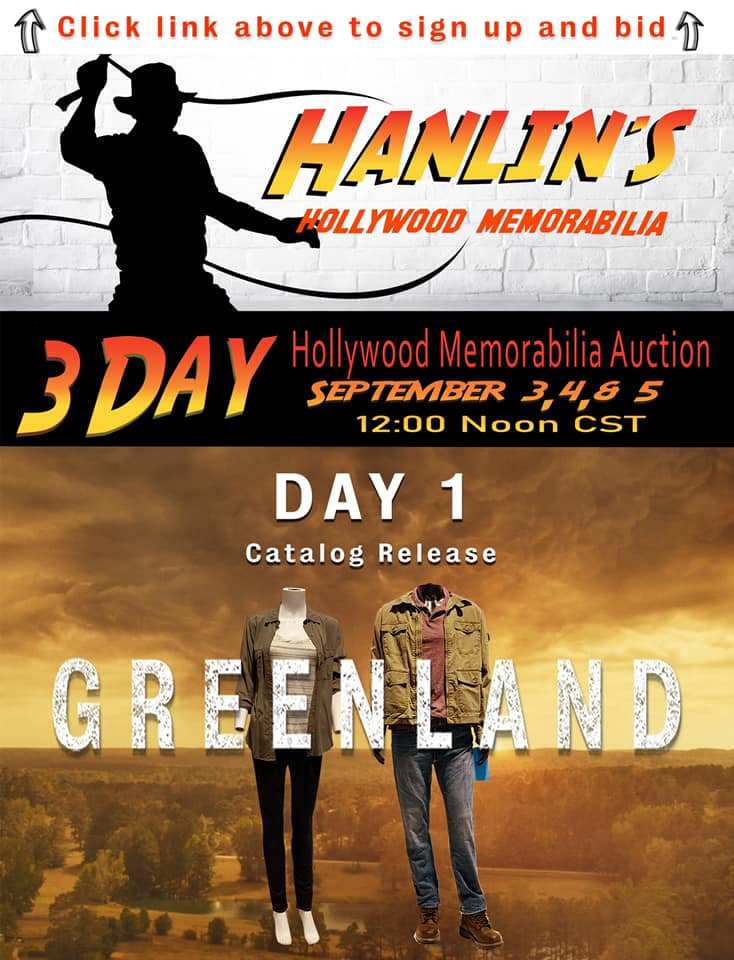 Hanlin’s Auction Service will be having a three day Hollywood Memorabilia auction on September 3-5 2021. The auction is set to take place on the auction site icollector, see link at the bottom of this post. Day one of the auction has been loaded to the icollector site and features a large collection of props and costumes from the Gerard Butler, ‎Morena Baccarin‎ disaster movie Greenland (2020). As of the time of this blog post there are 100 lots from the Greenland movie listed.