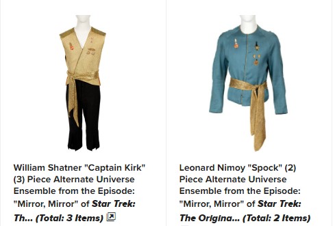 There are three main cast costumes from the original series season 2, episode 4 titled “Mirror, Mirror” up for bidding. In that episode a transporter malfunction sends Kirk and his party to a cutthroat parallel “mirror” universe.