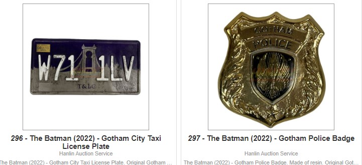Items from the Star Wars series of television and movies are up for bidding including a Stormtrooper Blaster used in The Force Awakens, pictured above. If you like Batman there are several lots of props from the 2022 Batman such as Gotham Police Badge, Police Coat, a Taxi license plate and a few other items.