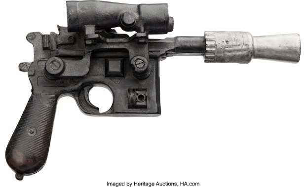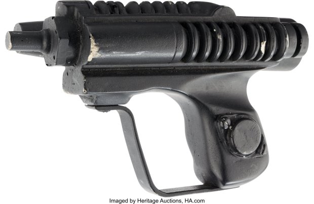 The original prop EC-17 hold-out blaster from 1983’s Return of the Jedi is no less extraordinary. The so-called “scout pistol” was wielded by an Imperial Scout Trooper on Endor, and in the Star Wars Universe, it was ostensibly manufactured by BlasTech Industries. But, of course, its maker was decidedly earthbound: art director James Schoppe, from whose armory this lightweight pistol comes.