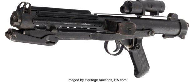 This Imperial Stormtrooper hero E-11 blaster, made by legendary screen weaponeers Bapty & Co. and used in the original Star Wars, came from the collection of the film’s producer Gary Kurtz. In a letter accompanying the weapon, Kurtz says, “This gun is the original Sterling sub-machine gun used in Star Wars, and the additional dressing (sight, grips, cut down cartridge casing, etc.) are also all original film used pieces.”