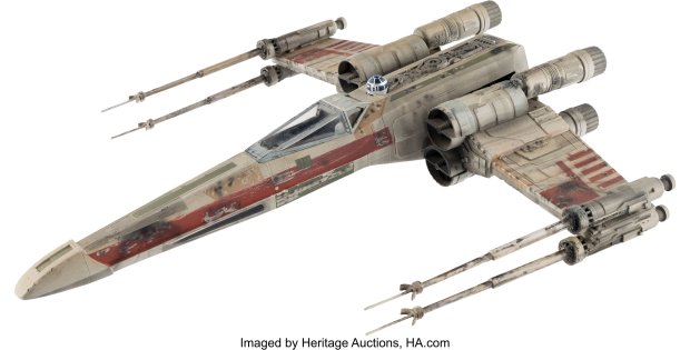 Another Empire prop offered here will surely put collectors on Cloud Nine — or, at least, Cloud City. It’s the foot-long, almost-foot-wide miniature X-wing Rebel Alliance starfighter used in Empire — good ol’ Red Five herself. This dogfighter transported Luke from Hoth to Dagobah (for his training with Yoda) to Lando Calrissian’s Cloud City, where Vader was turning Han Solo into a human-sized carbonite popsicle. Per Academy Award-winning visual effects artist Brian Johnson, the model was made at Industrial Light & Magic and “used on a number of multi-element motion control shots.”