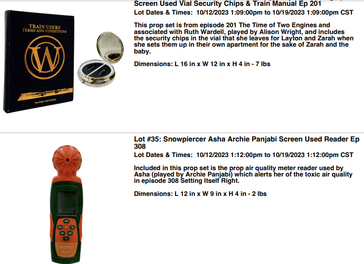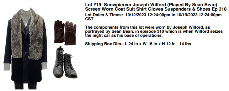VIP Fan Auctions is back on the railway with the Snowpiercer auction part 2. After a successful part 1 auction another opportunity is arriving this month to acquire an original piece of memorabilia of the production. This auction has 167 lots of original props, costumes and production items from the popular television series. There many main cast lots up for your bid most having complete costumes.