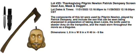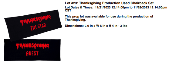 VIP Fan Auctions and Spyglass Media Group present the auction of original props and costumes from the horror film “Thanksgiving” currently in theaters. Just in time for the turkey holiday the auction starts on Tuesday November 21 and ends on December 5, 2023. There are 217 lots broken up into two weekly auction groups.