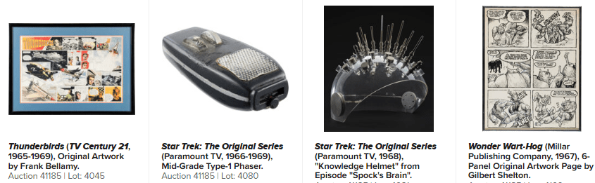 This offering from the late legendary Hollywood Model/Prop maker has 314 lots filled with scripts, costumes, props, artwork, comic artwork, vintage toys and some well crafted replicas made by Greg Jein himself. Collectors will find screen used original pieces of Hollywood history from titles like Star Trek, Buck Rogers, V, Amazing Stories, Battlestar Galactica, Masters of the Universe and more.