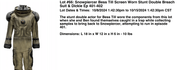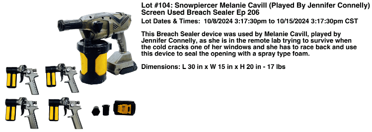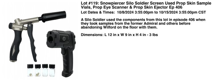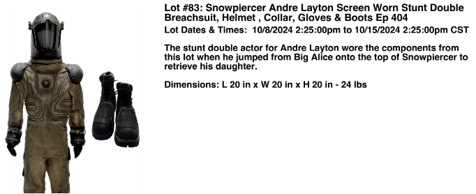 VIP Fan Auctions is back on the rails with the series finale auction of props and costumes from the hit series Snowpiercer. The official Snowpiercer: One Train auction has 285 lots featuring items from the final season. The auction event is set to start on Tuesday October 8, 2024 with two one week auctions back to back. This is the fourth Snowpiercer auction held the other three auctions took place in 2023 & 2024.