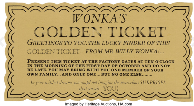 Tom Hanks’ iconic “co-star” from Robert Zemeckis’ 2000 film Cast Away – a screen-matched “Wilson” — found its way to a new home for $162,500. And several bidders driven by pure imagination fought over one of the rare surviving golden tickets from 1971’s Willy Wonka & the Chocolate Factory. A gold-foil, screen-used ticket gaining its lucky recipient admittance to Wonka’s candy factory realized $118,750.