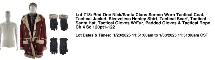 Next up for VIP Fan Auctions is the Amazon-MGM Studios holiday action film Red One prop and costume auction. Red One was released during the holiday season in 2024 and is now streaming on Amazon Prime. The film features an impressive star-studded cast, including The Rock, Chris Evans, Lucy Liu, and J.K. Simmons, which adds to its appeal.
