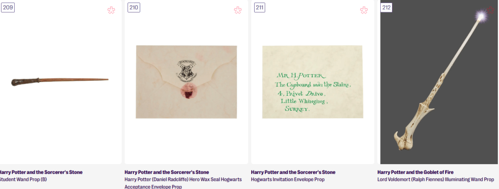 Harry Potter collectors have the opportunity to bid on two original props: a wand used by Ralph Fiennes as “Lord Voldemort” in Harry Potter and the Goblet of Fire ($10,000 – $20,000) and a wax seal acceptance envelope used by Daniel Radcliffe as “Harry Potter” in Harry Potter and the Sorcerer’s Stone ($6,000 – $8,000).