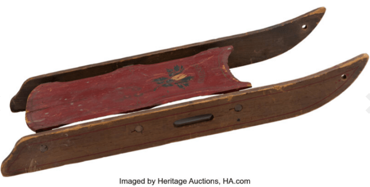 Long thought lost, this original “Rosebud” sled from Citizen Kane is one of only three known to survive and was miraculously saved from disposal by director Joe Dante in 1984 while filming on the former RKO lot. Crafted of pine and matching the detailing of the known examples, this sled is a fabled artifact from Welles’ masterpiece. With its red paint, stenciled lettering and unmistakable aura, this sled embodies the very symbol of Kane’s lost innocence and one of cinema’s most enduring mysteries.