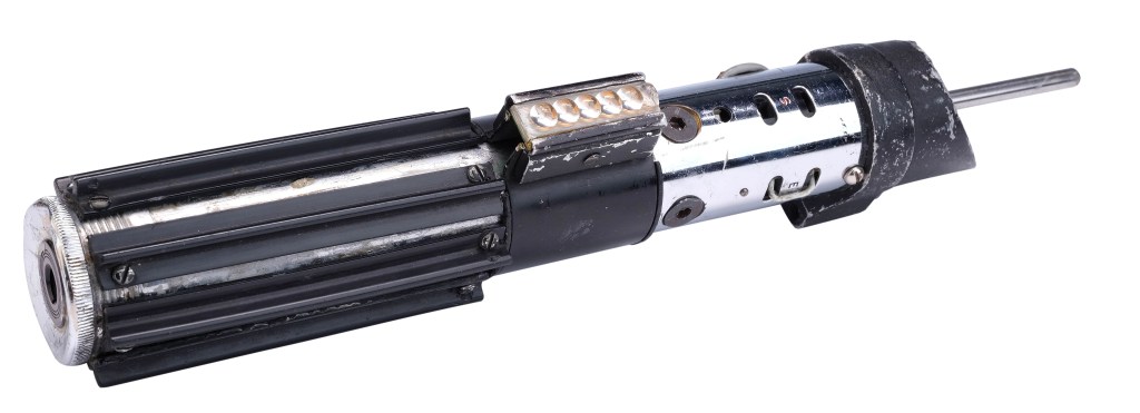 It is constructed from a vintage British press camera flash handle that was transformed into Vader’s infamous weapon through the fitting of dressing components such as plastic grips, calculator bubbles, and cosmetic wiring. This specific prop was further modified with a custom blade-mounting system that facilitated the installation of a wooden rod; the rod served as the blade during the choreographed fight scenes and made the physical, on-camera dueling possible. It also later served as a guide for visual effects artists to add the hand-animated glow for the final shots.