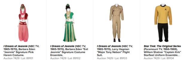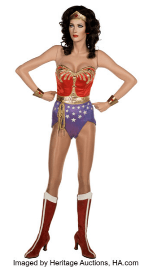 Lynda Carter’s signature Wonder Woman costume, complete with red, white and blue corset, golden cuff bracelets and her golden “Lasso of Truth” sold for $225,000. Two of Henry Winkler’s Fonzie leather jackets from Happy Days brought $87,500 and $75,000, and two of William Shatner’s Captain Kirk costumes from Star Trek — one his Starfleet uniform, the other his “Mirror, Mirror” episode alternate-universe ensemble — sold for $62,500 and $52,500, respectively.
