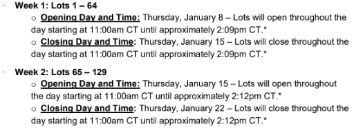 There are 129 lots that will be made available to the public, split over two one-week auctions beginning on Thursday, January 8, 2026, with the final auction ending on January 22, 2026. See the image below. A full color PDF catalog is available now on the VIP Fan Auctions website.