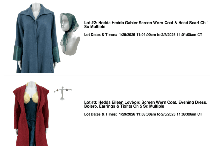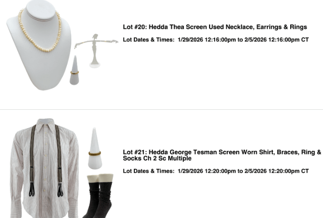 VIP Fan Auctions will be launching a one week only bidding event on props and costumes from the movie Hedda. This 49 lot auction will feature a diverse selection of costumes worn by the characters to distinctive props that played significant roles throughout the film.